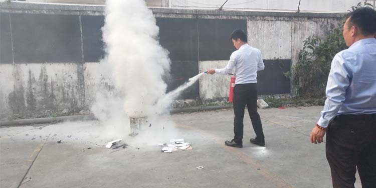 公司消防隊員使用手提式干粉滅火器進行滅火演示,全體員工現場觀看。