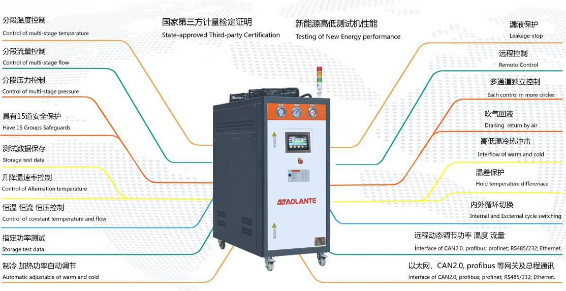 深圳奧蘭特機械開發(fā)的新能源動力電池液冷測試系統(tǒng)、電池包恒溫冷卻系統(tǒng)溫度控制范圍-60~110℃,流量2-100L/min,壓力恒定0~400Kpa;控溫精度:±0.1℃,壓力控制精度±0.1L。數(shù)據(jù)精度都由國際第三方檢測機構(gòu)出具證書。